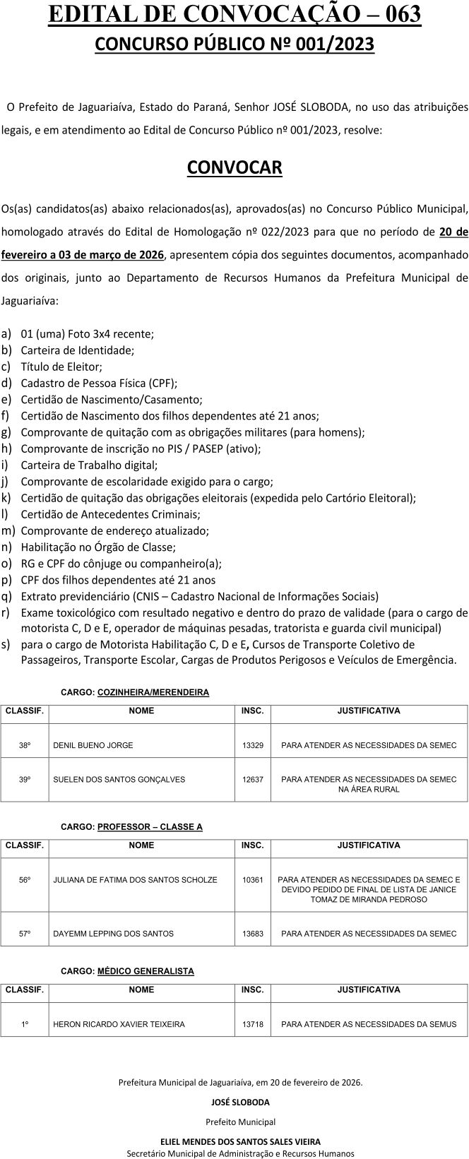 Edital de Convocação 063 - Concurso Público 001/2023 Edital de Convocação 063 - Concurso Público 001/2023