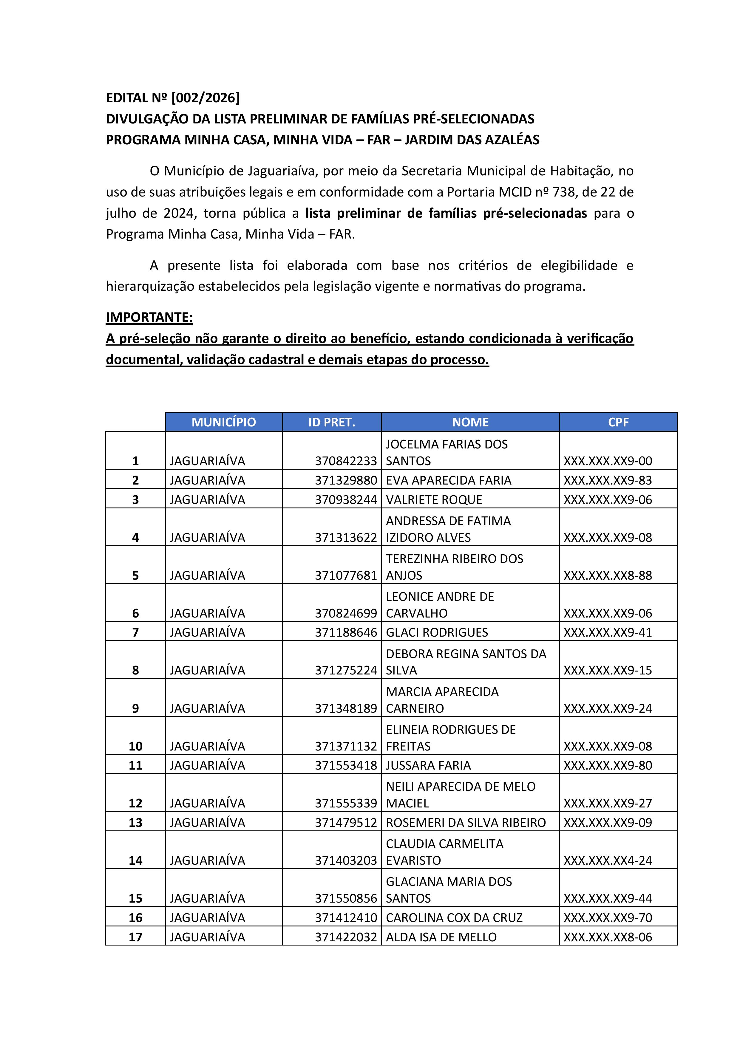 A Prefeitura, por meio da Secretaria Municipal de Habitação (SEMHAB), divulga o Edital nº 002/2026 com a lista preliminar das famílias pré-selecionadas para o Programa Minha Casa, Minha Vida – FAR, no empreendimento Jardim das Azaléas.